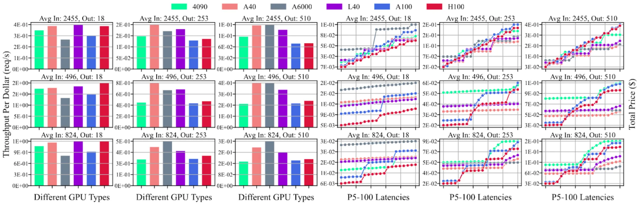 Figure 3: Benchmarked results for Llama3-70B model with different GPU types on different workload types. The left three columns represent the throughput results, x-axis represents different GPU types, y-axis represents throughput per unit price (i.e., throughput divided by GPU cost). The right three columns represent the latency results, x-axis represents the P5-100 latency results (P5-P100 Latencies means from left to right, the x sticks represent P5 Latency, P10 Latency, P15 Latency…), y-axis represents total price (i.e., each latency time multiplied by GPU cost)