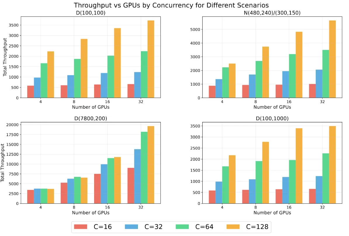 To better understand this question, we benchmark our system with up to 32 GPUs and 128 concurrent requests, under various settings.